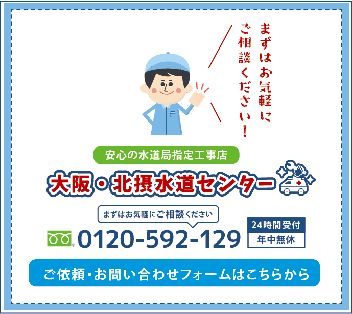大阪・北摂水道センターは、蛇口やトイレの水漏れから給排水のつまり、水漏れなどおうちのトラブルを専門に対応しております。地域密着、国家資格を取得したスタッフが訪問させていただきます。蛇口のパッキン1個から、水まわりであればどんな内容でも電話1本でお伺いいたします。また、弊社は安心の出張費無料、見積無料でお伺いさせていただきます。お見積もりにご納得いただけなければ、料金は一切かかりませんのでご安心ください!