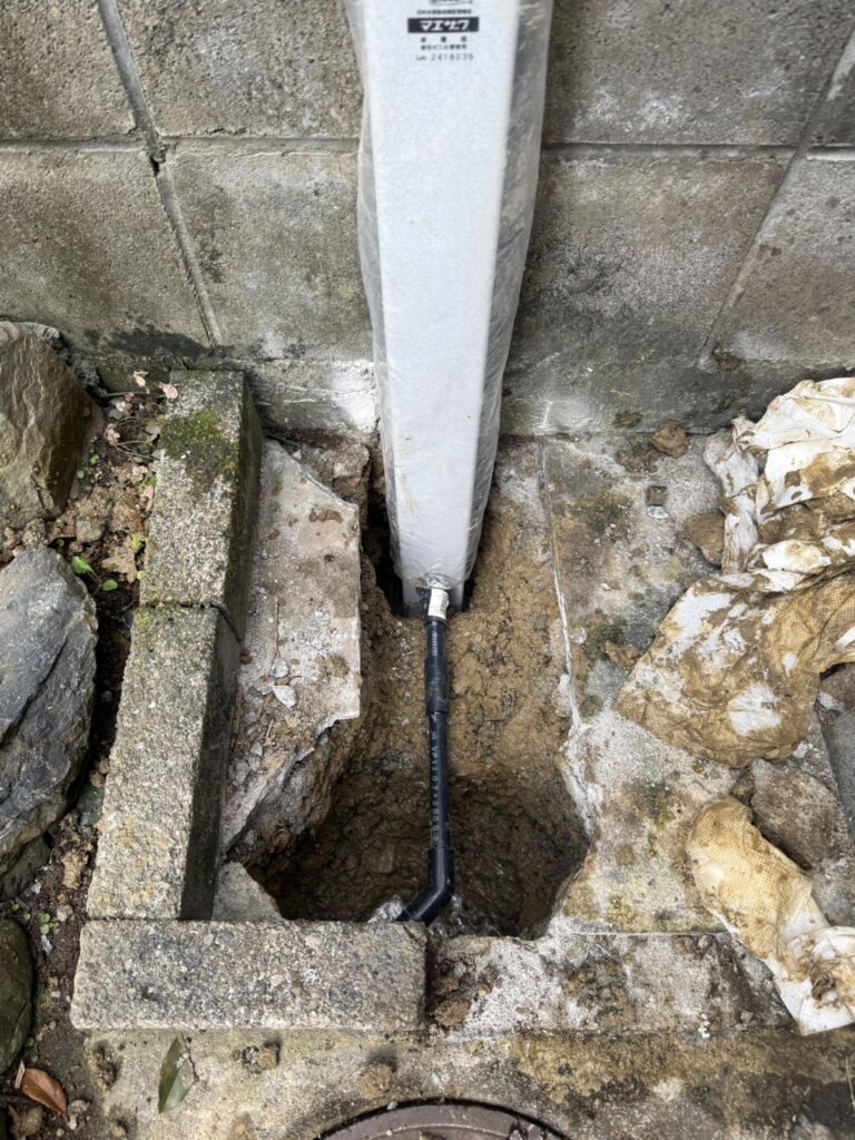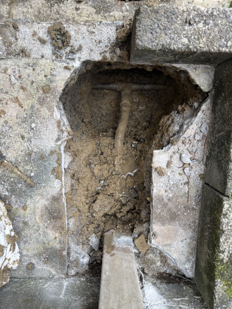水栓柱の埋設部分に原因があると判断し、コンクリートを一部解体して確認したところ、給水管との接続部分から水がにじみ出していました。