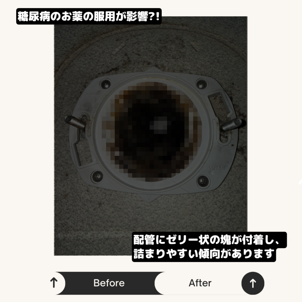 服薬の影響などで排泄物が固まりやすくなり、詰まりにつながるケースは他のお宅でも確認されています。